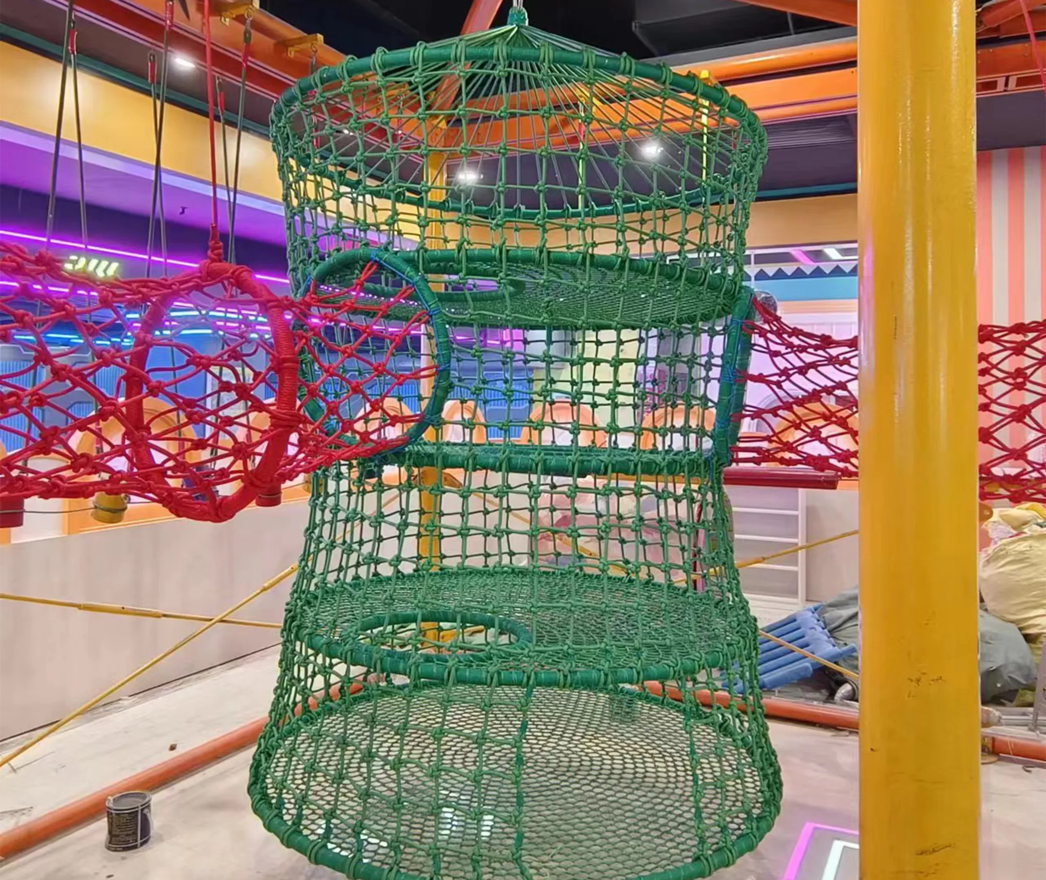 Material | High-strength elastic nylon rope net (rainbow colors: red, yellow, blue, green; non-toxic, wear-resistant, colorfast, UV-stabilized), galvanized steel hanging frame (orange, anti-rust), high-tensile hanging ropes (green, load-bearing), reinforced nylon stitching |